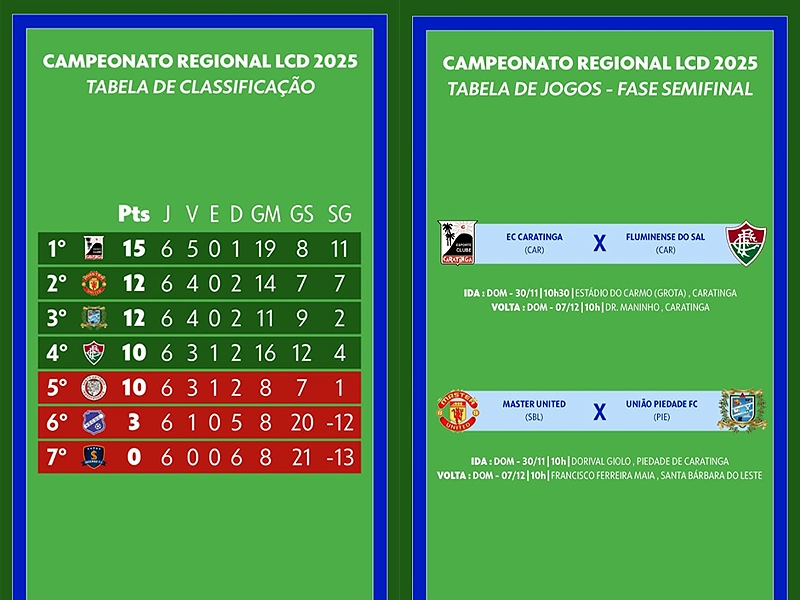 CARATINGA — A fase semifinal do Regional da Liga Caratinguense de Desportos (LCD) está definida. Os jogos de ida acontecem no próximo domingo (30). Após uma campanha impecável, Esporte Clube Caratinga, que encerrou a etapa classificatória com melhor aproveitamento. A equipe rubro-negra confirmou a boa