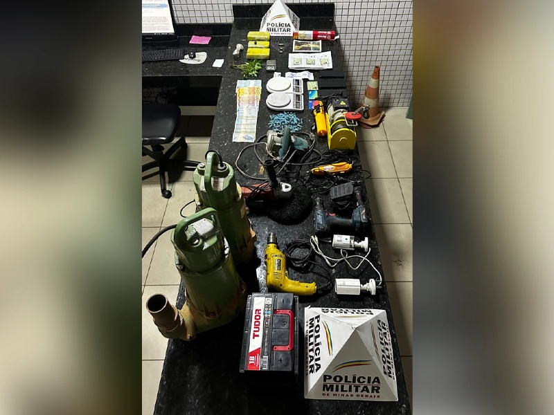 Foram apreendidos três barras de maconha, uma pedra bruta de crack, um tablete médio de maconha, uma bucha de haxixe, R$ 841,00 em dinheiro, duas munições calibre .380, uma munição calibre .38, um rolo de plástico filme, um caderno de anotações, três telefones celulares, duas balanças digitais, uma balança de precisão, duas bombas submersíveis, um guincho de coluna elétrico, uma serra mármore, uma esmerilhadeira, uma micro retífica, uma furadeira, uma parafusadeira/furadeira e duas câmeras de monitoramento.