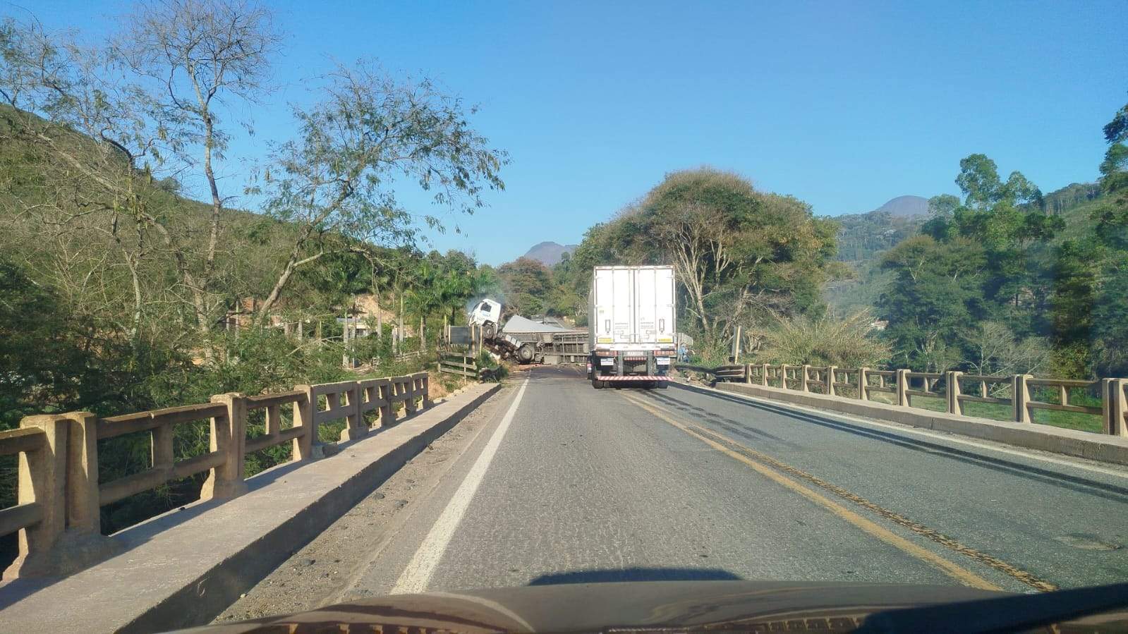IÚNA (ES) – Um acidente na manhã desta terça-feira (30) envolvendo um caminhão e uma viatura da Força Tática da Polícia Militar, interditou a BR-262, próximo à ponte São José, sentido Iúna X Manhuaçu.
