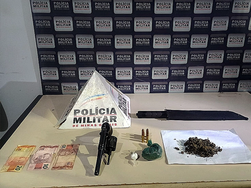 Nas buscas, os militares localizaram duas porções de maconha na residência do suspeito. Dentro do carro, foram encontrados um revólver calibre .38 com seis munições, um invólucro com cocaína, um facão, uma faca e R$ 40,00 em dinheiro. A mulher que o acompanhava foi detida.
