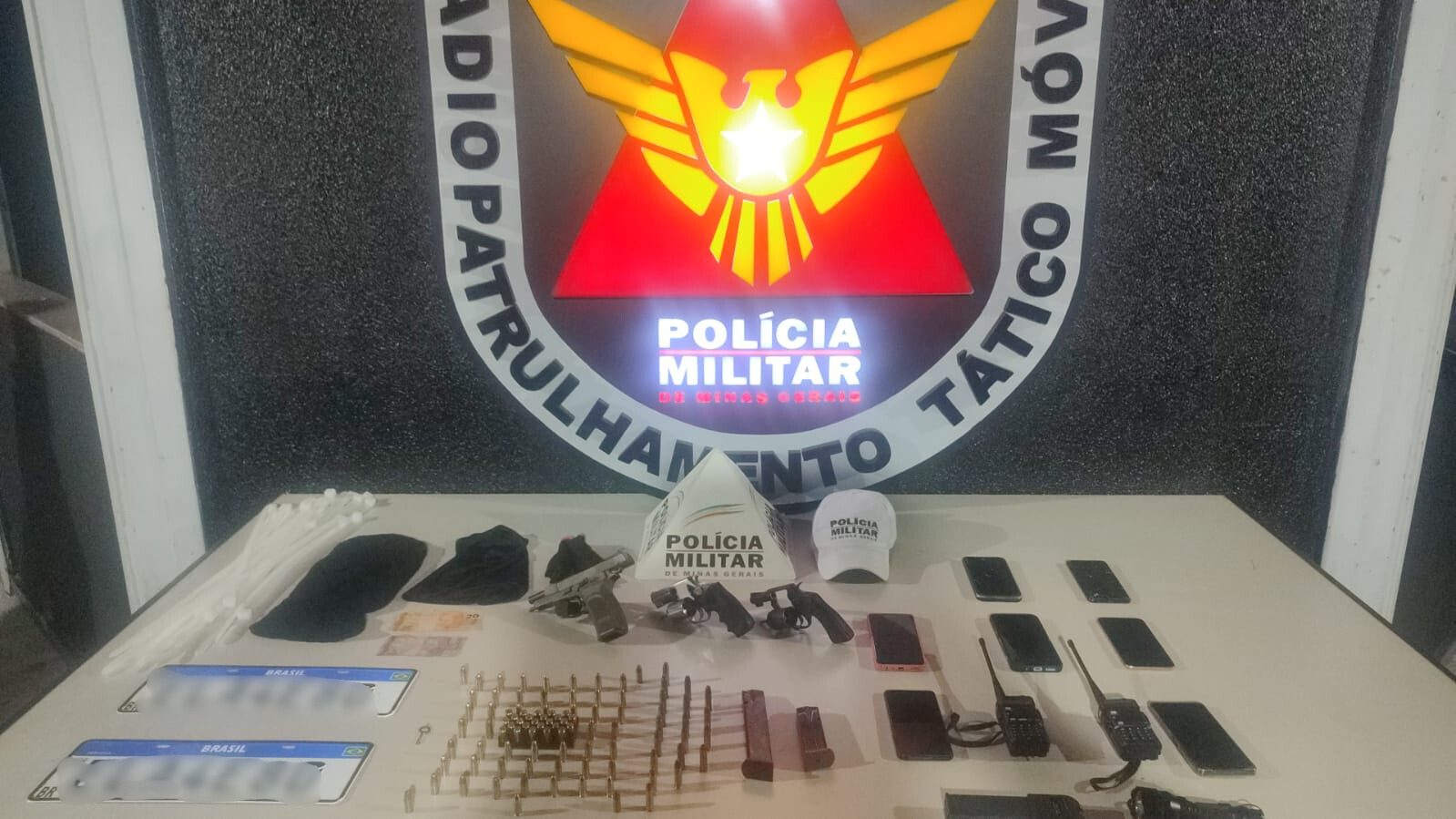 No veículo, foram apreendidos três armas de fogo, carregadores, grande quantidade de munições, toucas ninja, armas de choque e algemas plásticas.