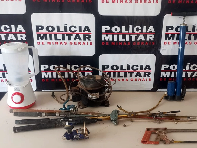 Entre os itens recuperados estão quatro varas de pescar, dois molinetes, um motor de geladeira, uma bomba de ar manual, uma serra com arco e um liquidificador — todos encaminhados à Delegacia de Polícia Civil, juntamente com os presos.