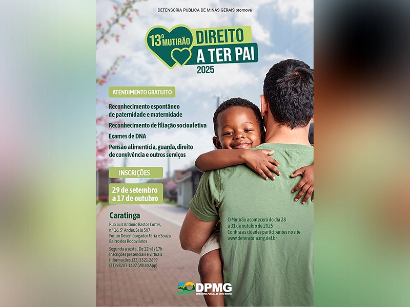 CARATINGA – A Defensoria Pública de Minas Gerais (DPMG) abriu inscrições para a 13ª edição do Mutirão Direito a Ter Pai, que ocorrerá entre os dias 28 e 31 de outubro em 37 unidades do estado, incluindo Caratinga. O prazo para se inscrever vai até 17 de outubro.
