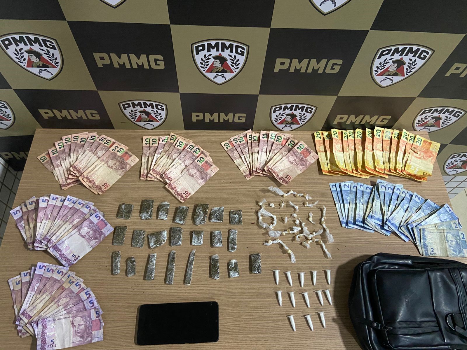 Durante a ação, foram encontrados materiais que confirmam a atividade ilícita. Foram apreendidos 13 pinos de cocaína, 22 porções de maconha, 43 pedras de crack, R$ 731 em dinheiro e um aparelho celular.