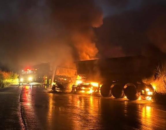 Colisão entre caminhões provoca incêndio na BR-262 e deixa quatro feridos leves em Martins Soares