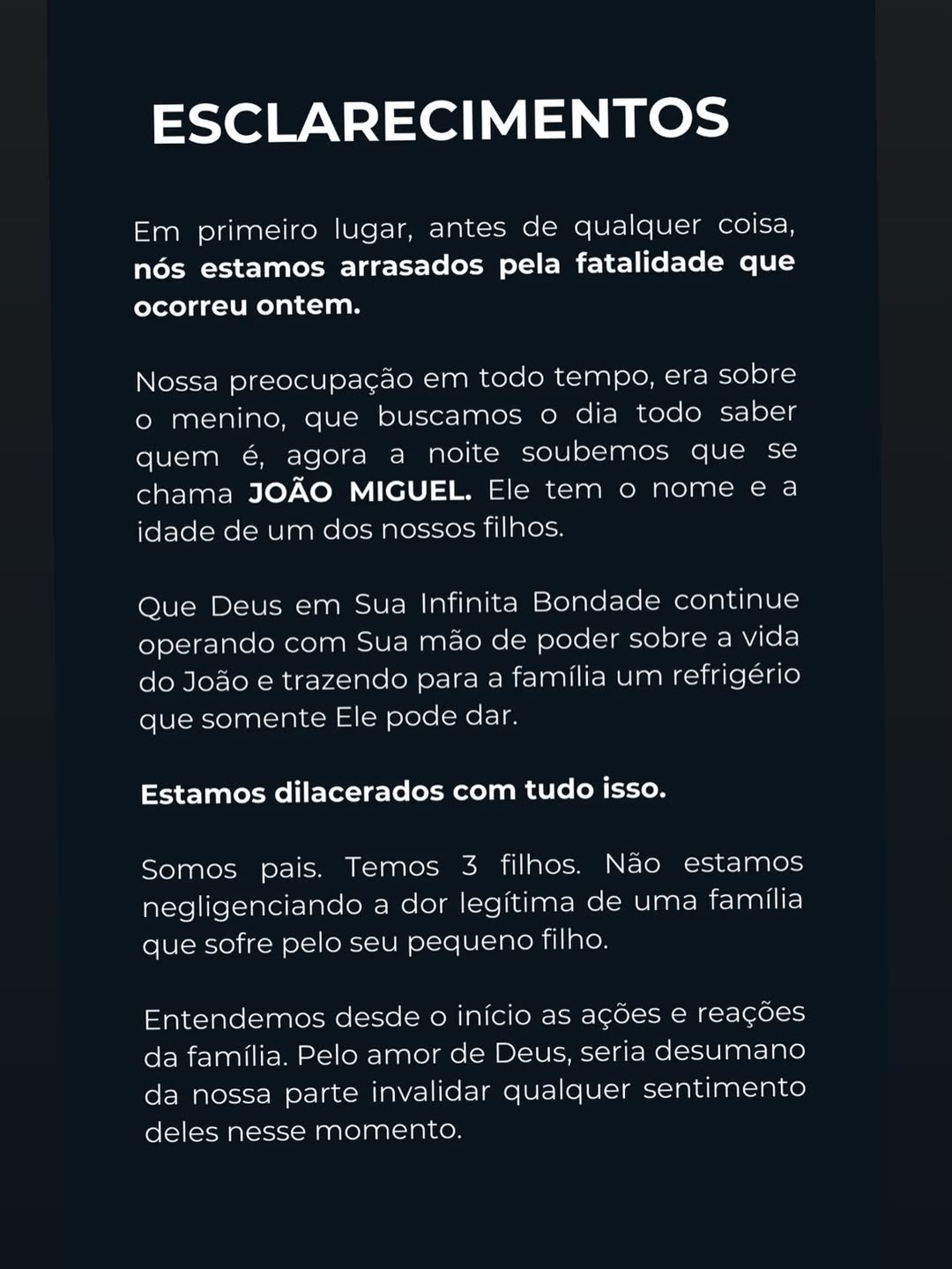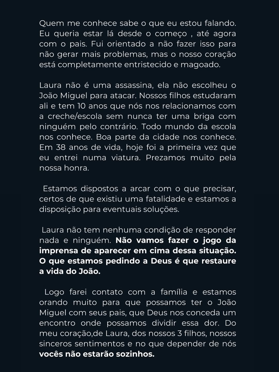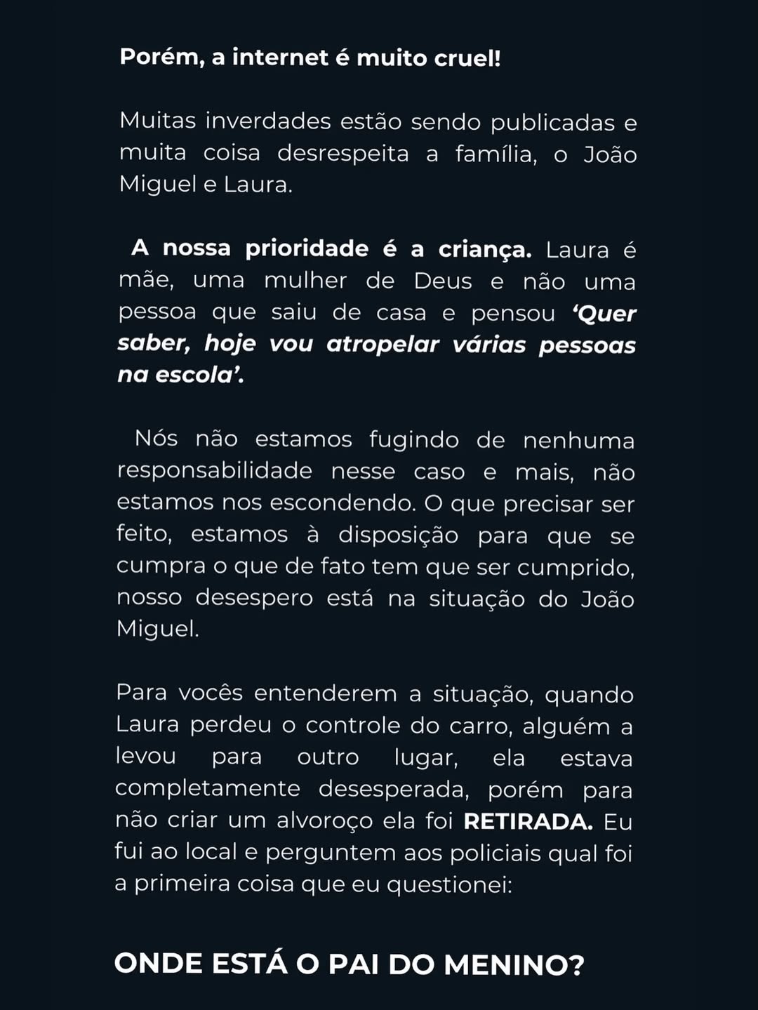 Na noite dessa segunda-feira (2), o esposo da motorista envolvida no grave acidente que vitimou o pequeno João Miguel, de 4 anos, divulgou uma nota de esclarecimento sobre o ocorrido.