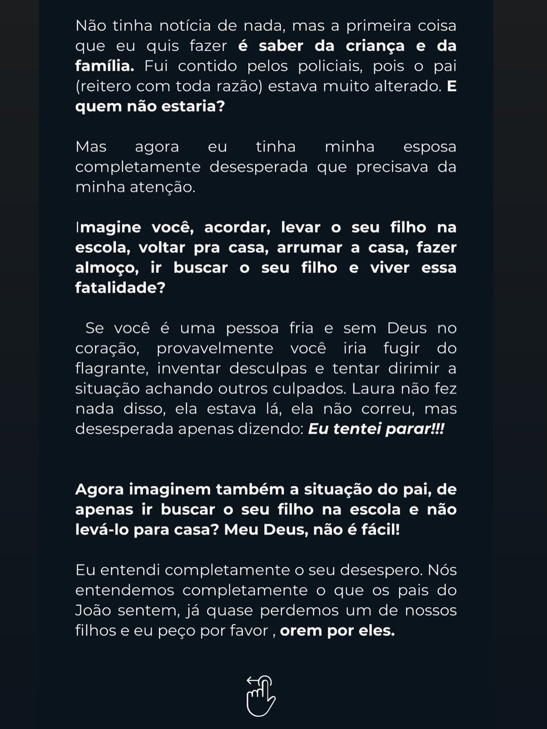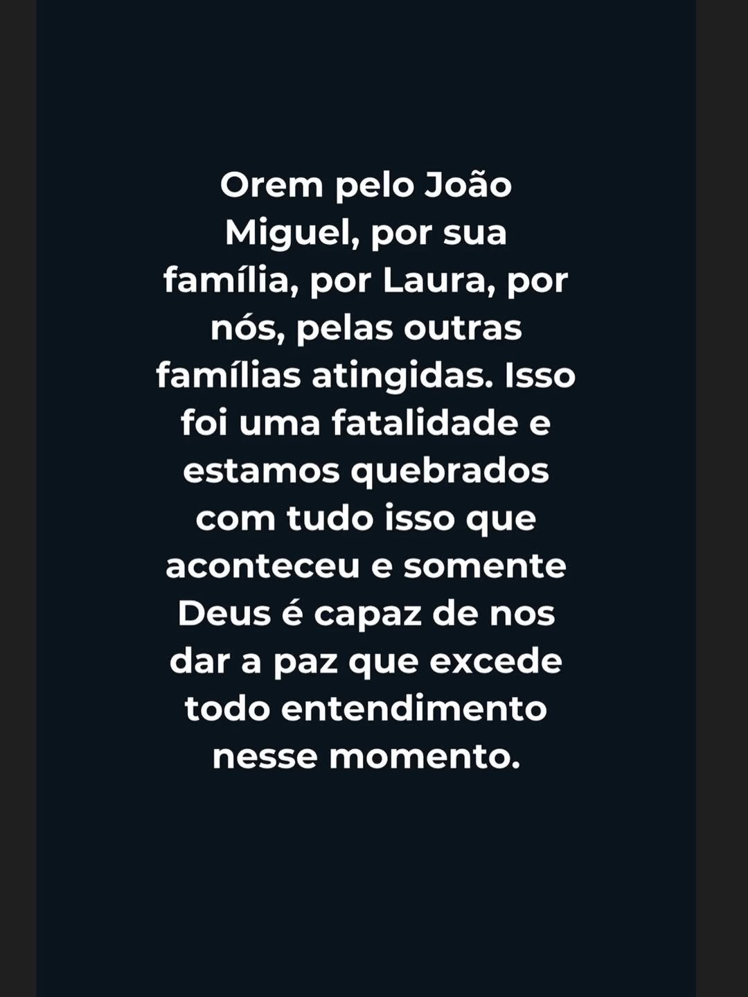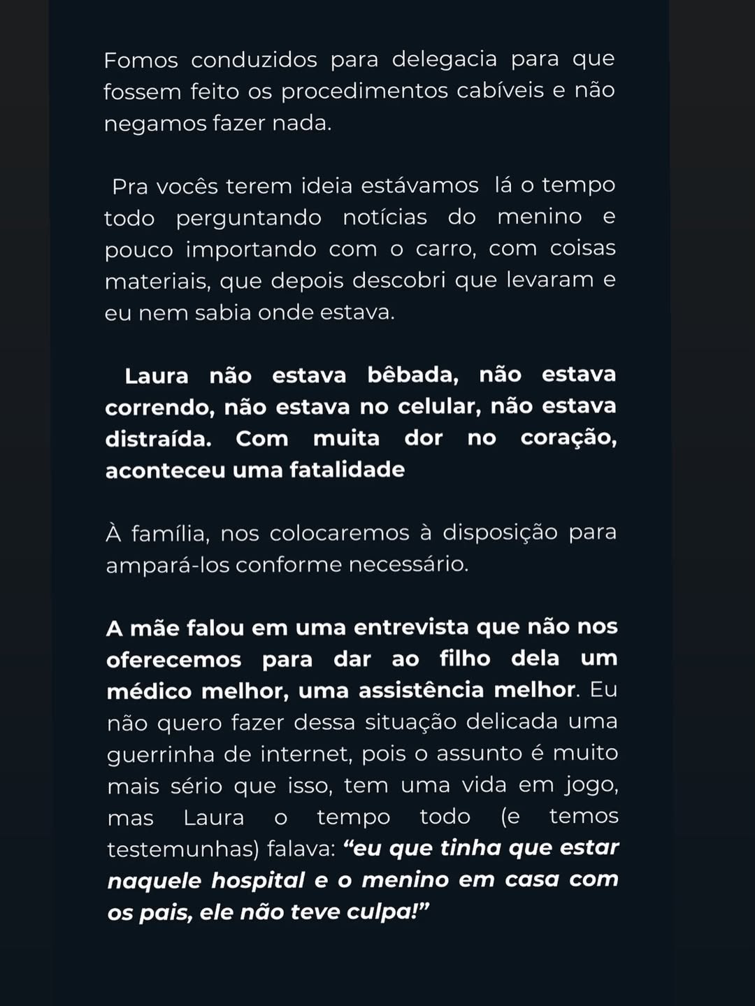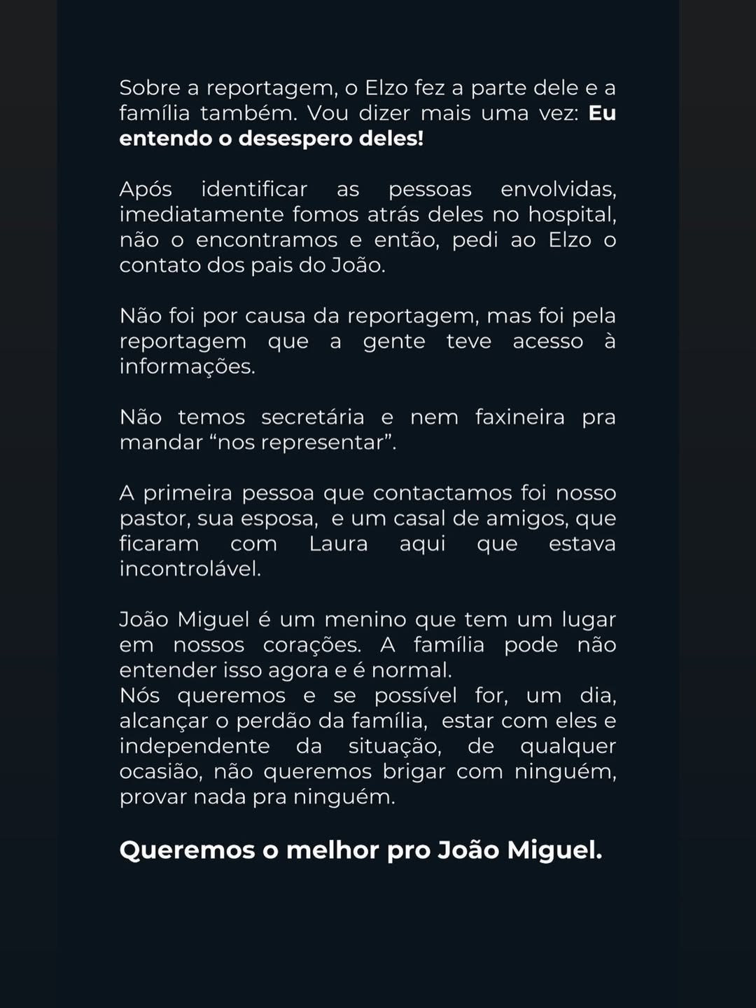Na noite dessa segunda-feira (2), o esposo da motorista envolvida no grave acidente que vitimou o pequeno João Miguel, de 4 anos, divulgou uma nota de esclarecimento sobre o ocorrido.
