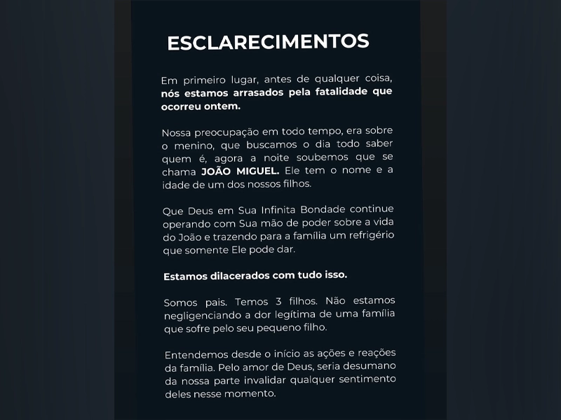 Na noite dessa segunda-feira (2), o esposo da motorista envolvida no grave acidente que vitimou o pequeno João Miguel, de 4 anos, divulgou uma nota de esclarecimento sobre o ocorrido.