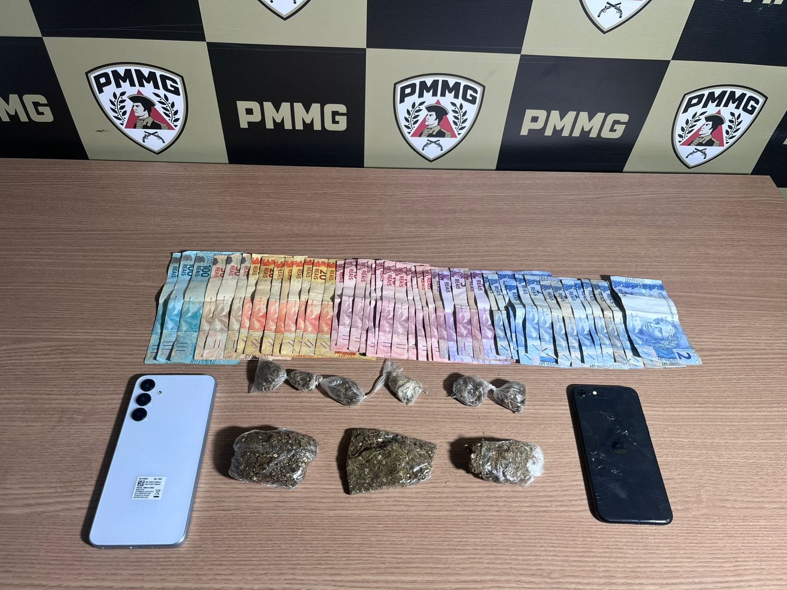 Os três foram abordados e identificados. Durante a busca pessoal, foram encontrados R$ 787 em dinheiro, seis buchas de maconha e dois aparelhos celulares, sendo um Samsung e um iPhone. Ao verificarem a lixeira onde a sacola havia sido descartada, os militares localizaram três tabletes de maconha prensada.