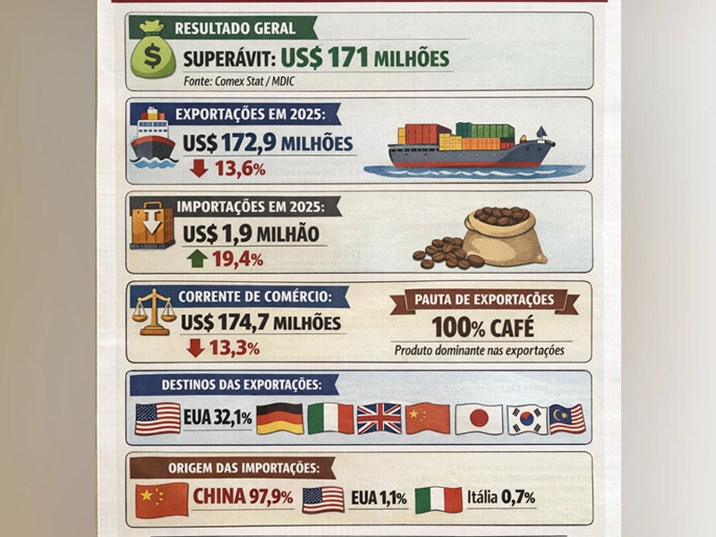 CARATINGA- Caratinga encerrou o período de janeiro a dezembro de 2025 com superávit de US$ 171 milhões em sua balança comercial, mantendo resultado positivo no comércio exterior, mesmo diante da retração no valor exportado em comparação com o ano anterior. Os dados são do sistema Comex Stat, do Ministério do Desenvolvimento, Indústria, Comércio e Serviços (MDIC).